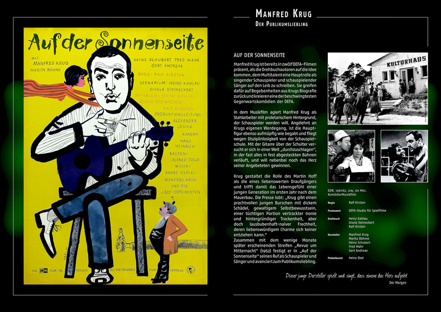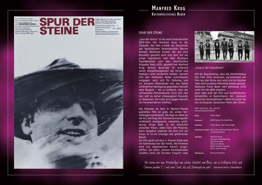 Er war Stahlschmelzer, singender „Tatort“-Kommissar, bärbeißiger Brummi-Fahrer und kauziger Anwalt. Er war der aufsässige Brigadier Balla im Film „Spur der Steine“, der 23 Jahre im Giftschrank der DDR lag, er war Unterzeichner der Biermann-Petition und hat mit „Abgehauen“ ein eindrucksvolles Zeitdokument verfasst. – Der im November 2016 verstorbene Manfred Krug war schon zu Lebzeiten Legende.