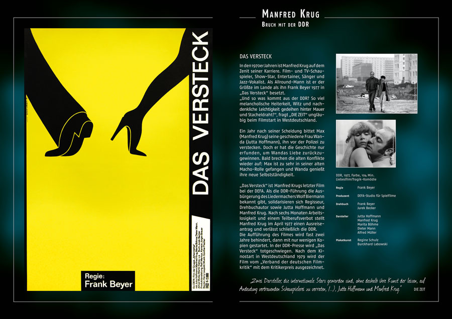 Vor diesem Hintergrund erinnern die 30 großformatigen Exponate an ausgewählte Stationen der Laufbahn des Ausnahmeschauspielers, von den Anfängen 1957 bis in das Jahr 2001. Der Schwerpunkt der Plakatausstellung liegt dabei auf seiner Zeit bei der DEFA. – Sein Weg vom Publikumsliebling zum unliebsamen Widersacher, der schließlich sein Land verlassen mußte und im anderen Deutschland zum gesamtdeutschen Publikumsliebling wurde.